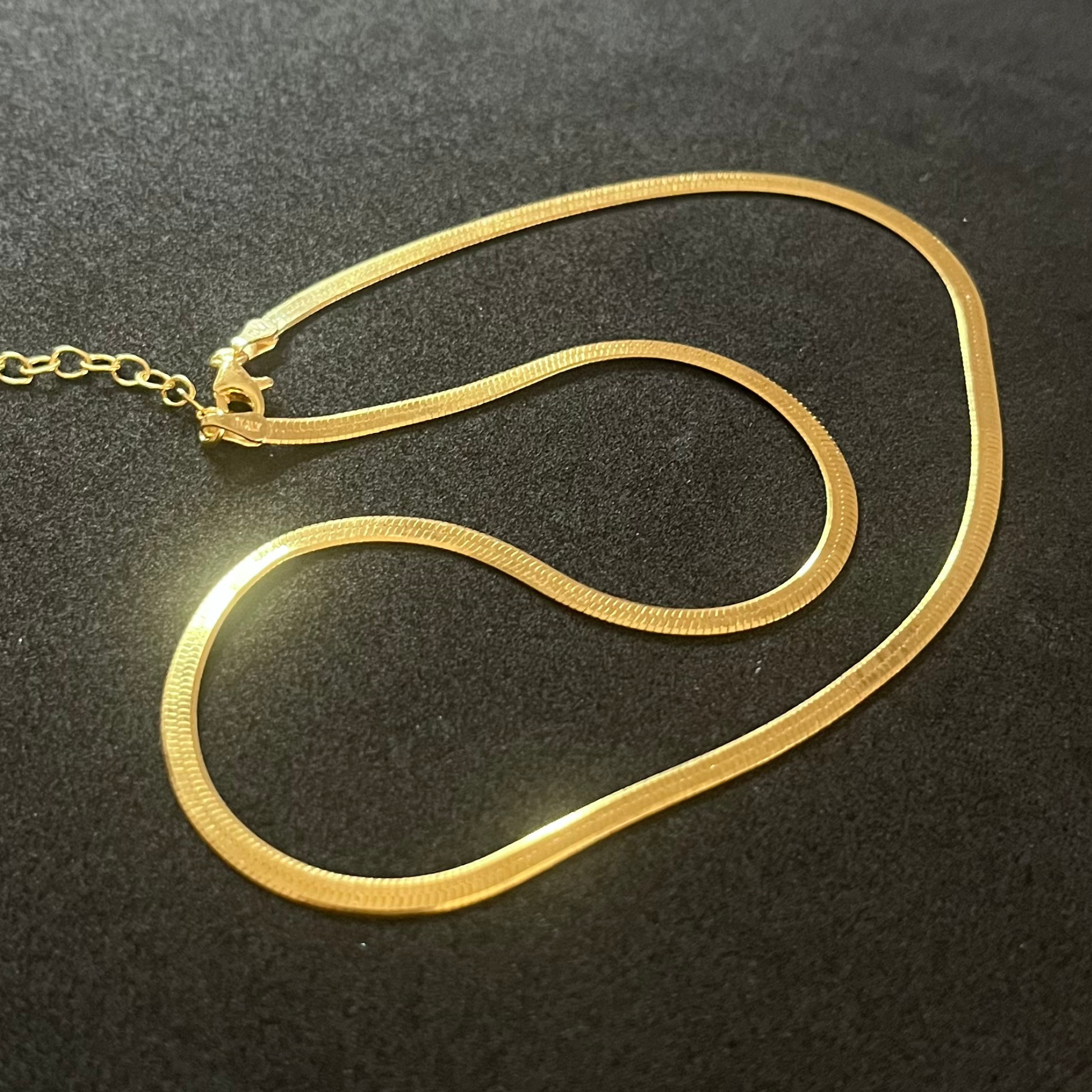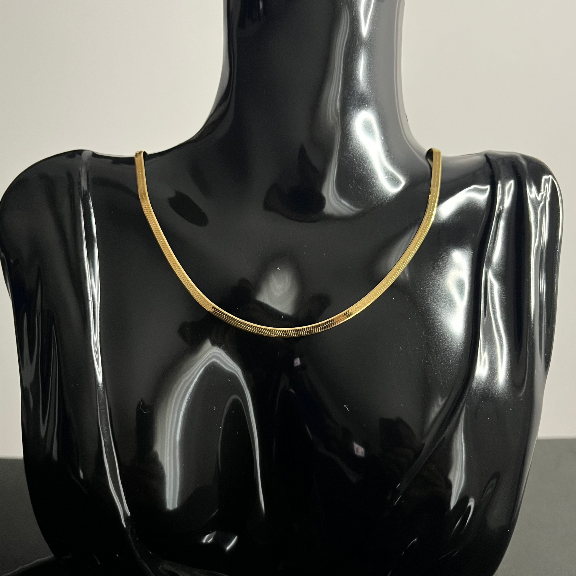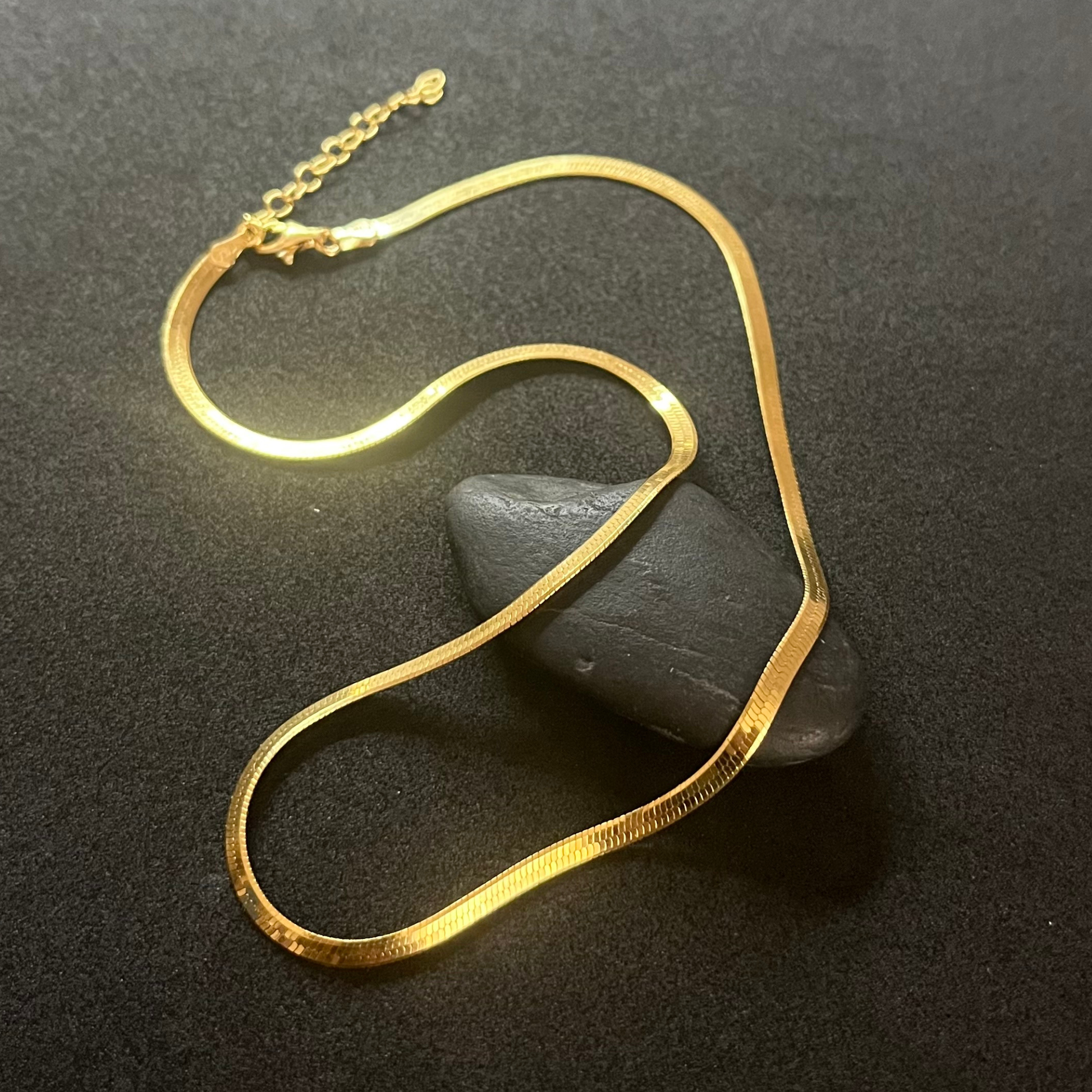 El collar Cinta Real deslumbra por su elegancia fluida y su brillo majestuoso. Una cadena plana estilo serpiente que se adapta con suavidad al contorno del cuello, reflejando la luz con un acabado pulido impecable. Su diseño versátil combina sofisticación y modernidad, ideal para elevar cualquier look con un toque de realeza contemporánea.