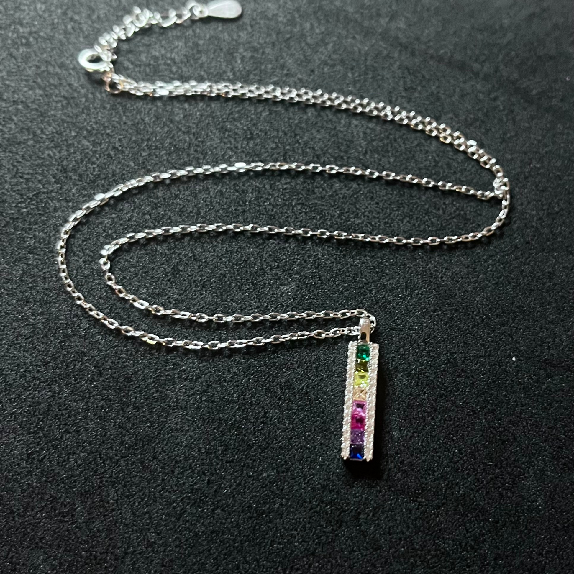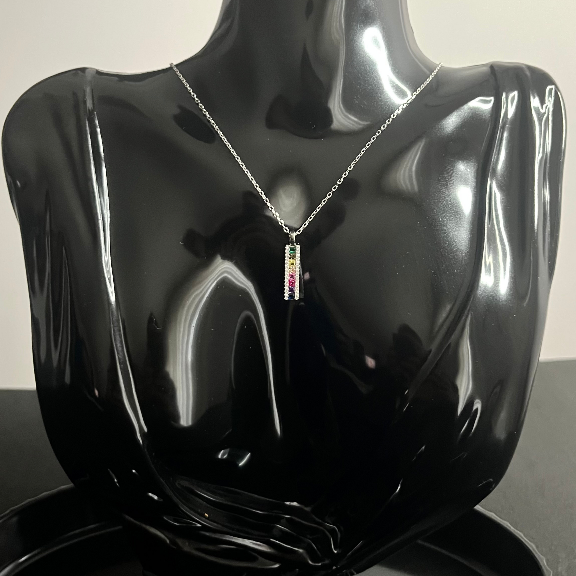 El collar Brillo Infinito irradia color, equilibrio y sofisticación. Su dije rectangular alberga una sucesión de circonitas en tonos vibrantes, enmarcadas por un destello de circonitas blancas que realzan su luminosidad. La pureza del metal y la energía del color se fusionan en una pieza que simboliza alegría, diversidad y armonía.