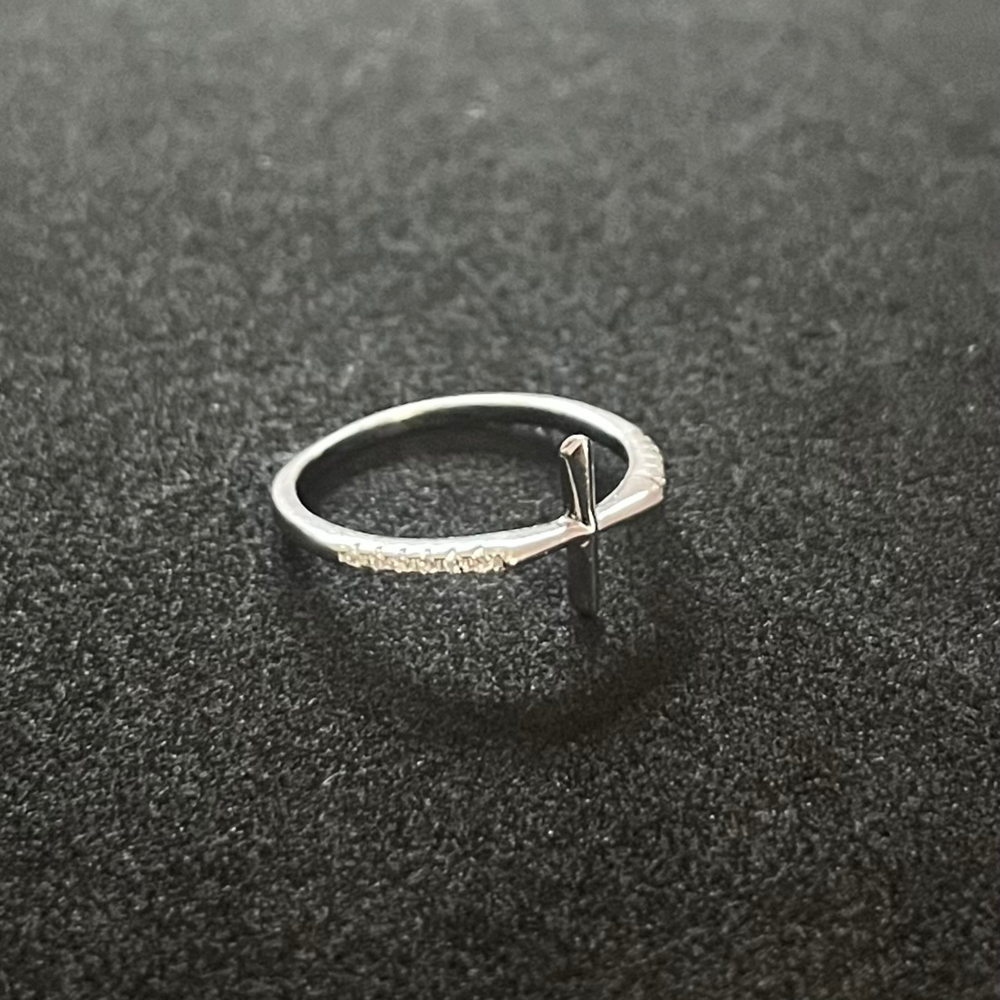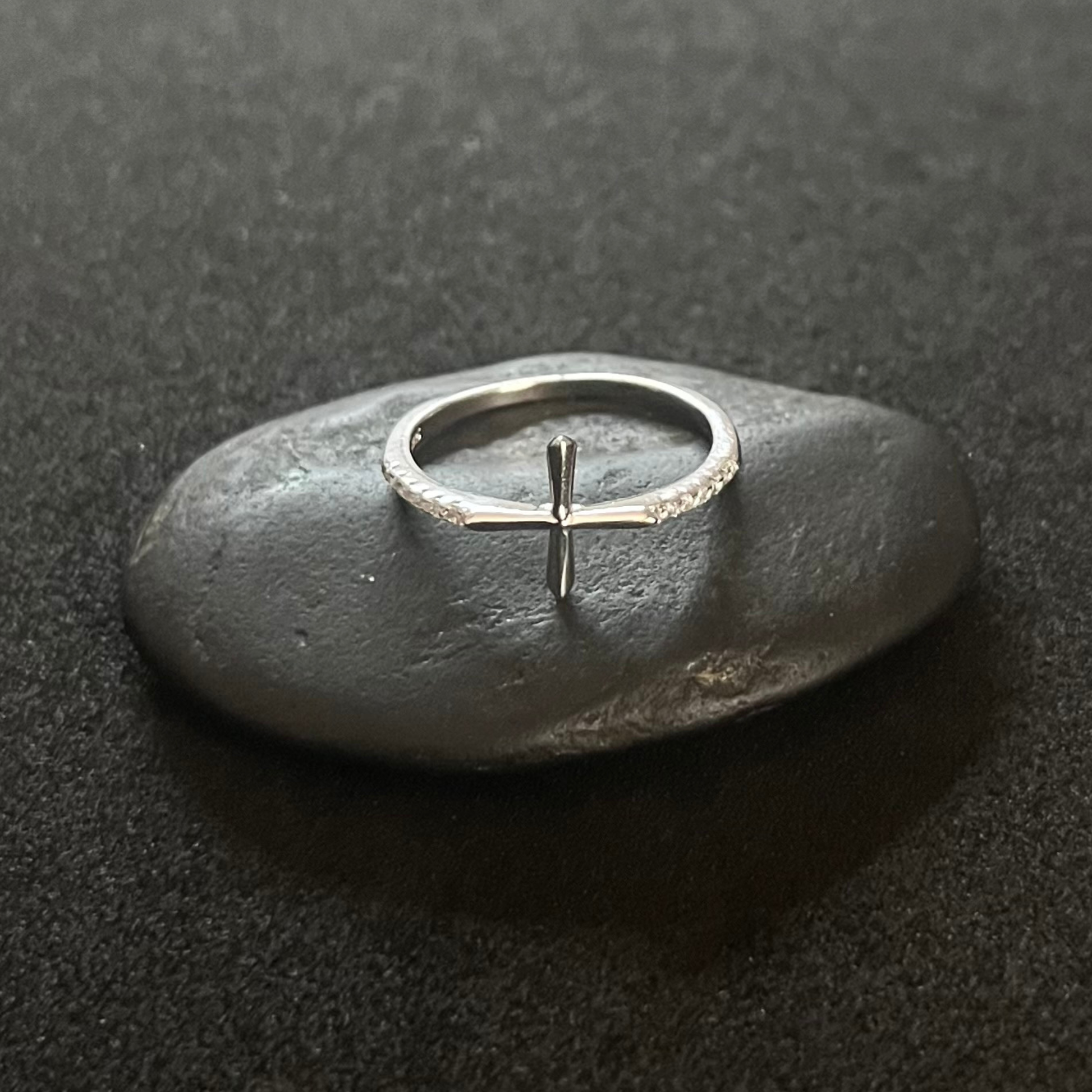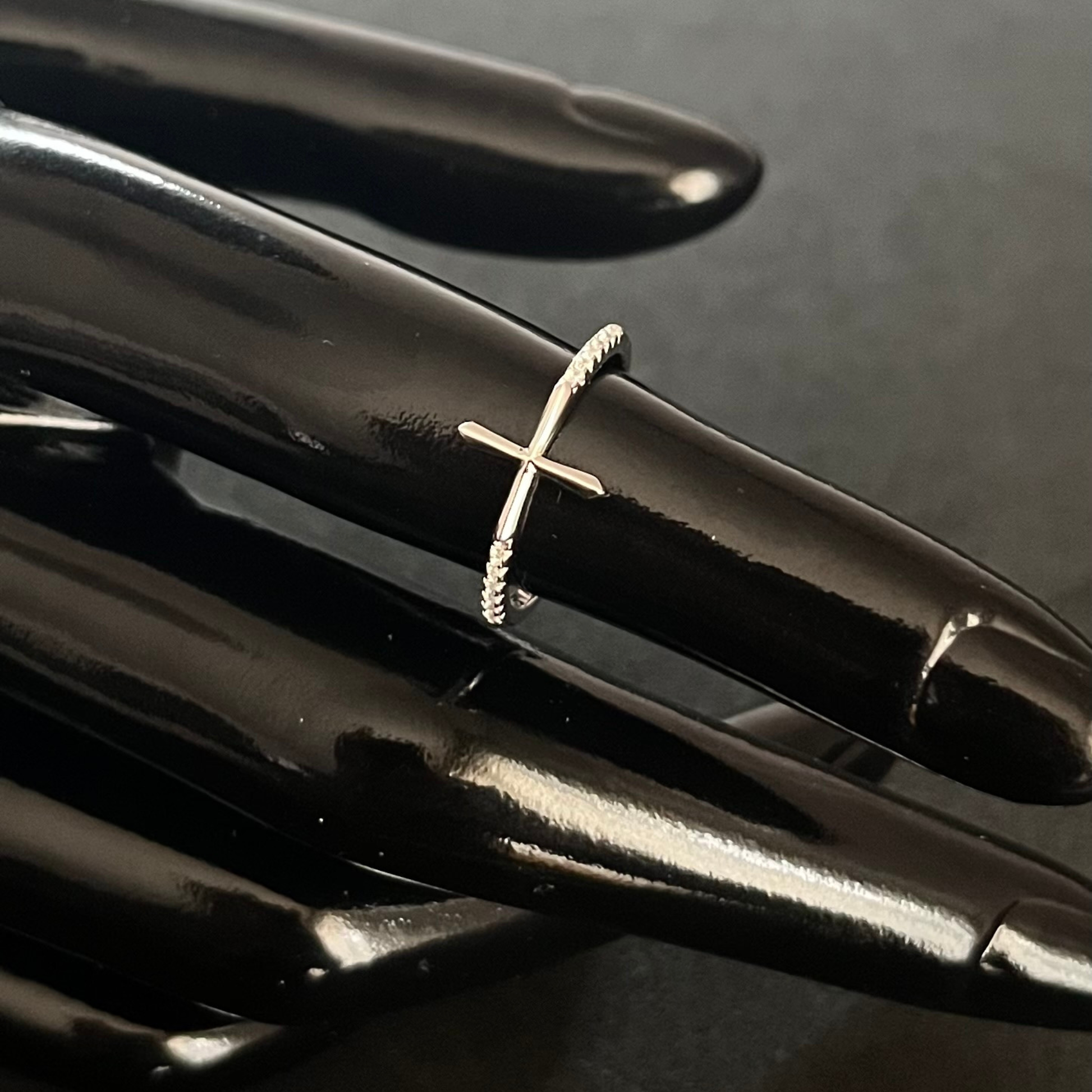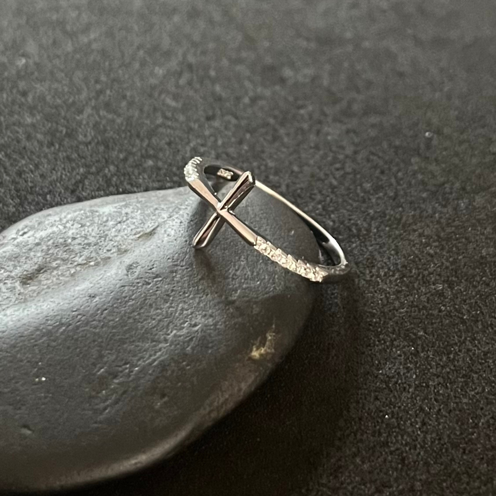 Anillo en plata de ley 925 rodiada con detalle de cruz y circonitas blancas.