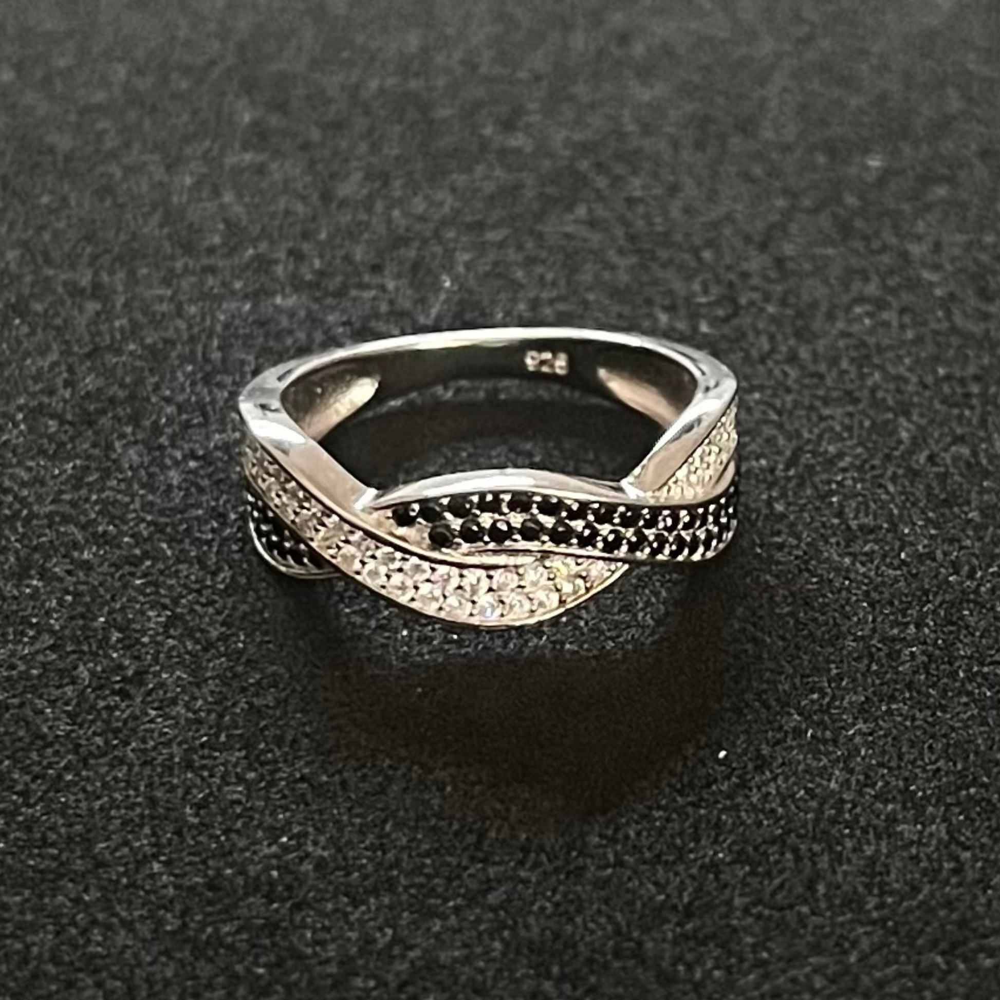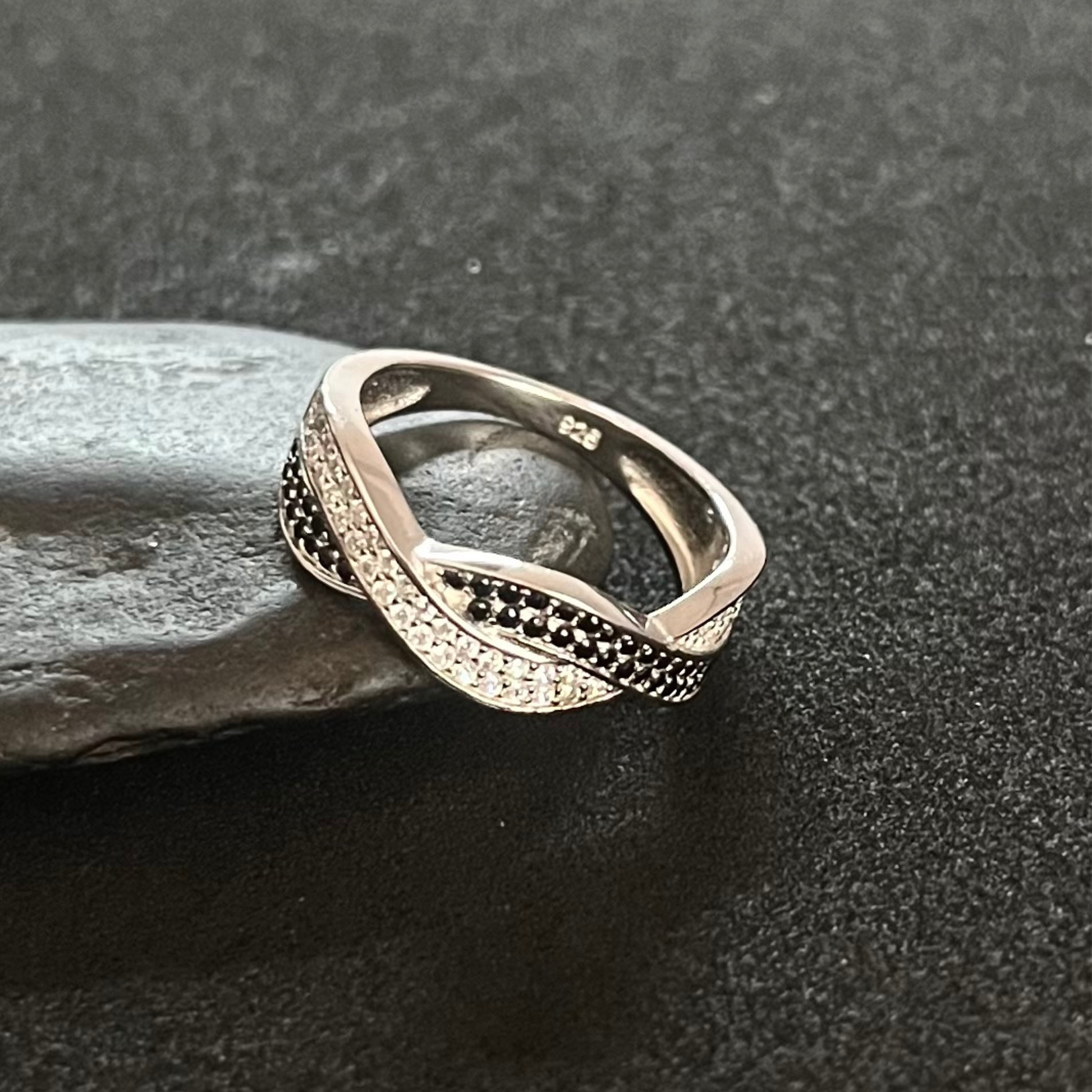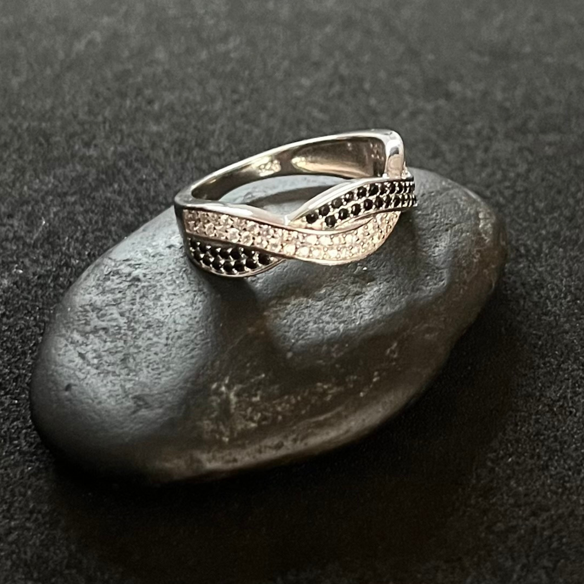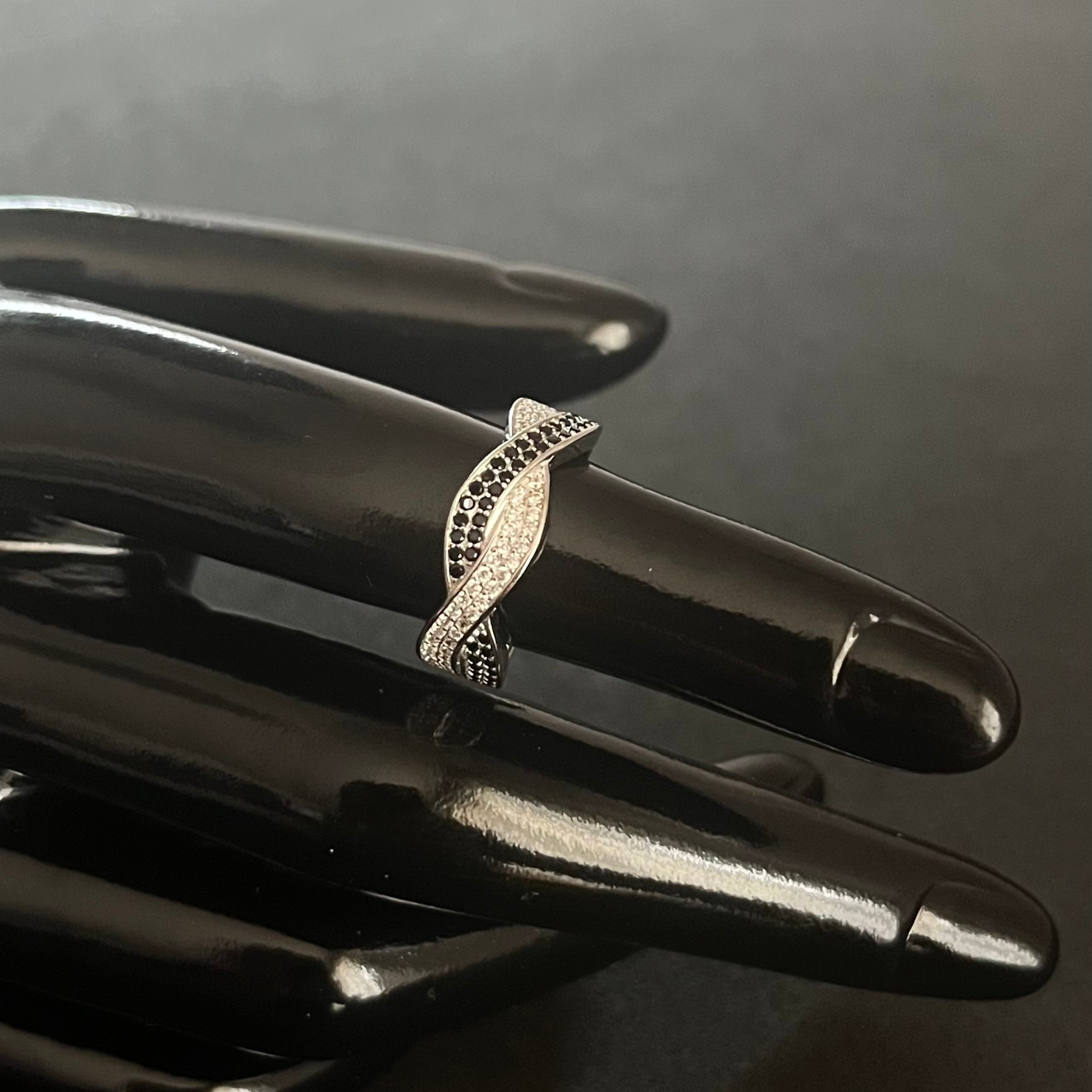 Anillo en plata de ley 925 rodiada con circonitas negras y blancas engastadas.