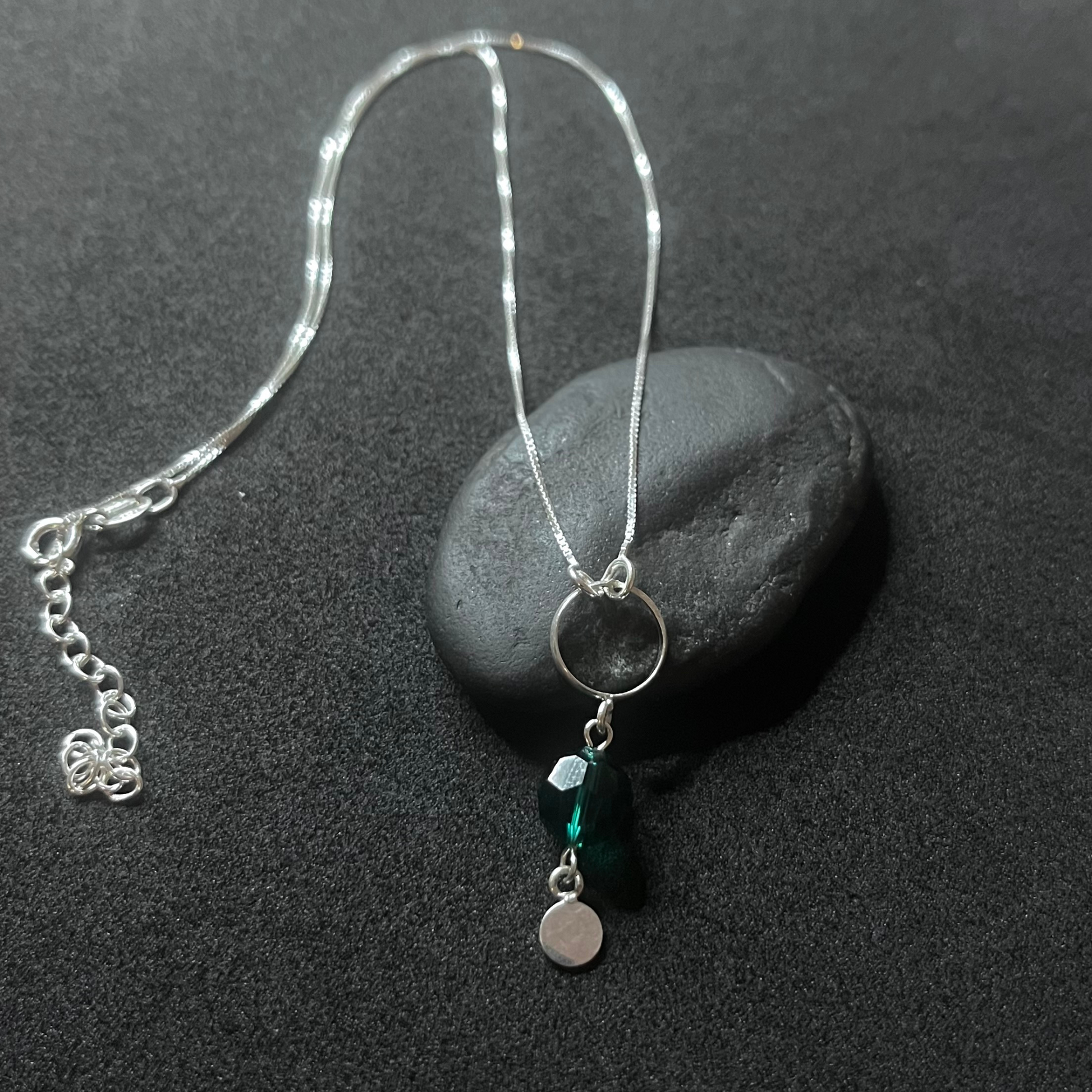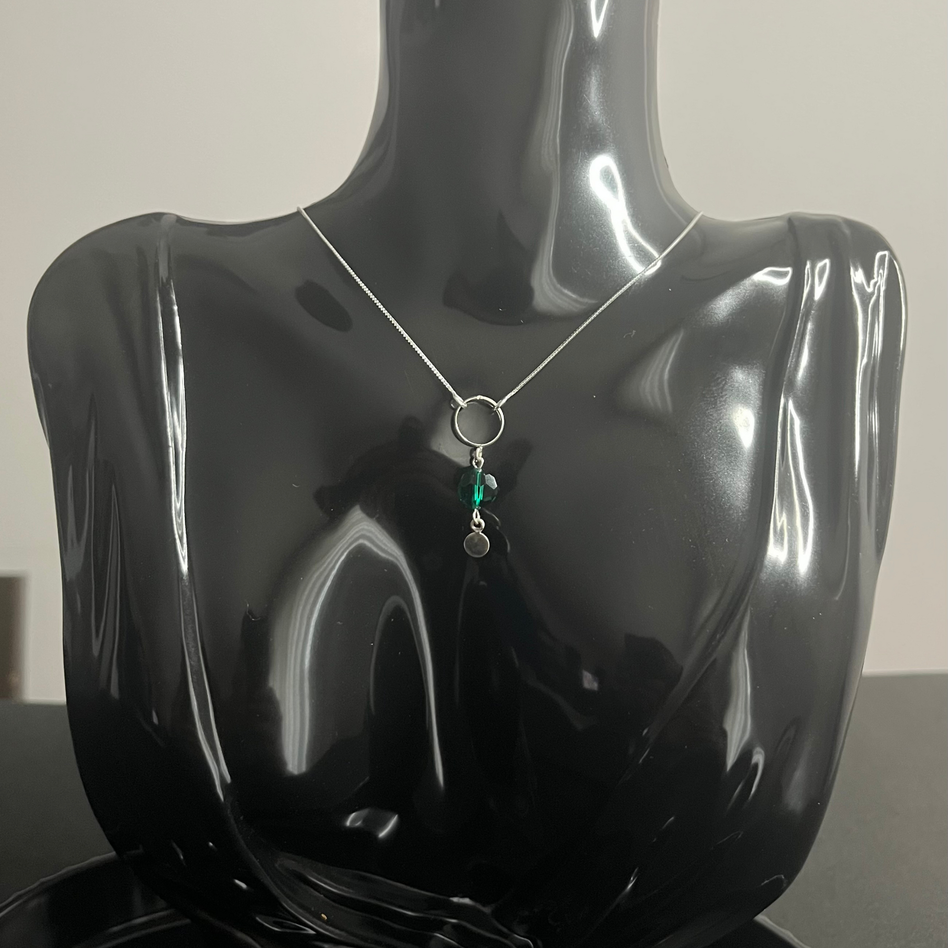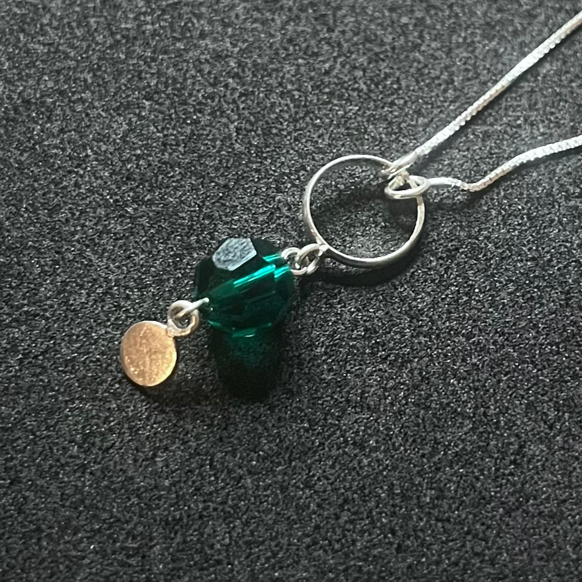 El collar Esmeralda Urbana combina equilibrio y frescura en una composición sutilmente moderna. Presenta un dije formado por un aro delicado, un cristal austriaco verde de brillo intenso y una pequeña plaquita pulida que aporta movimiento y luz.