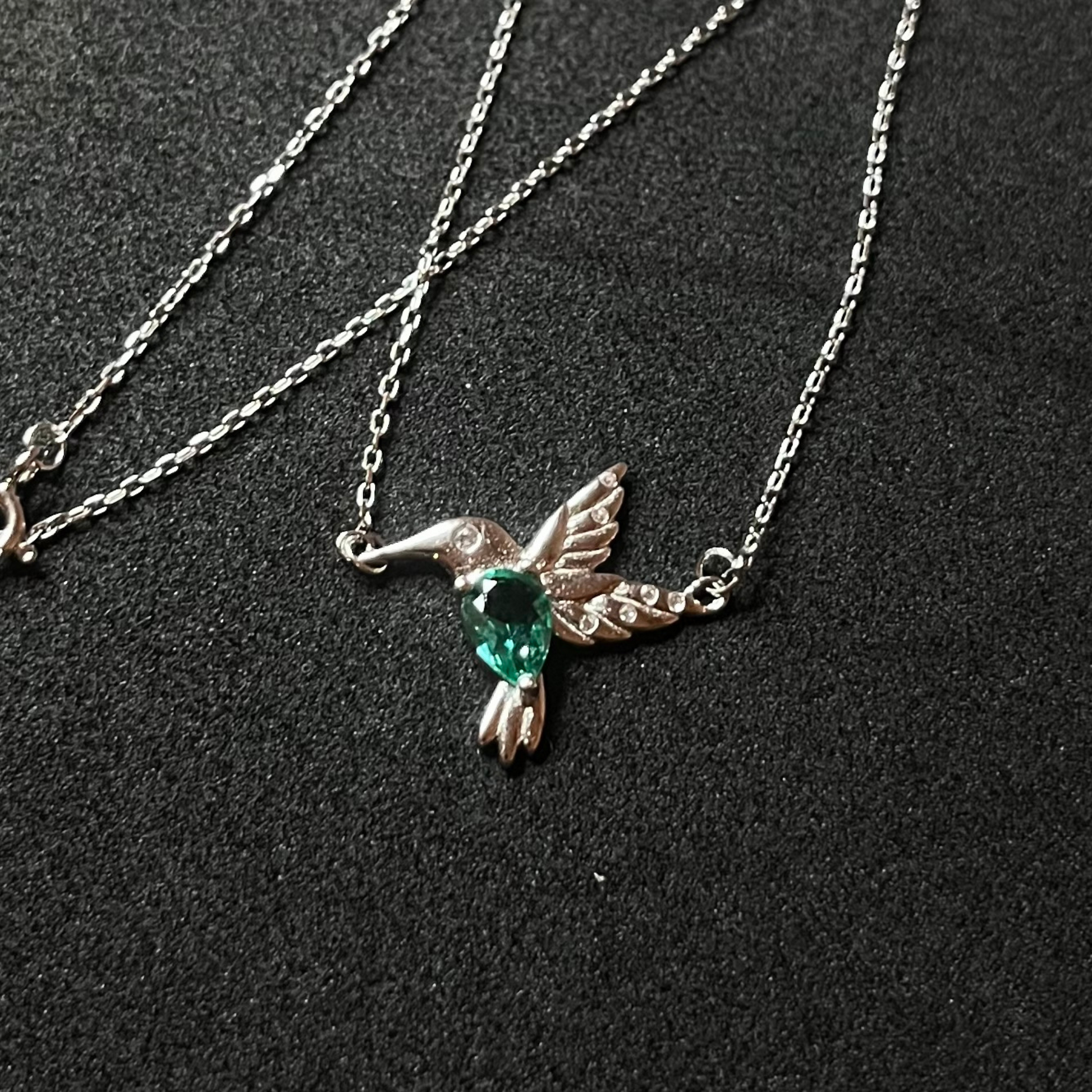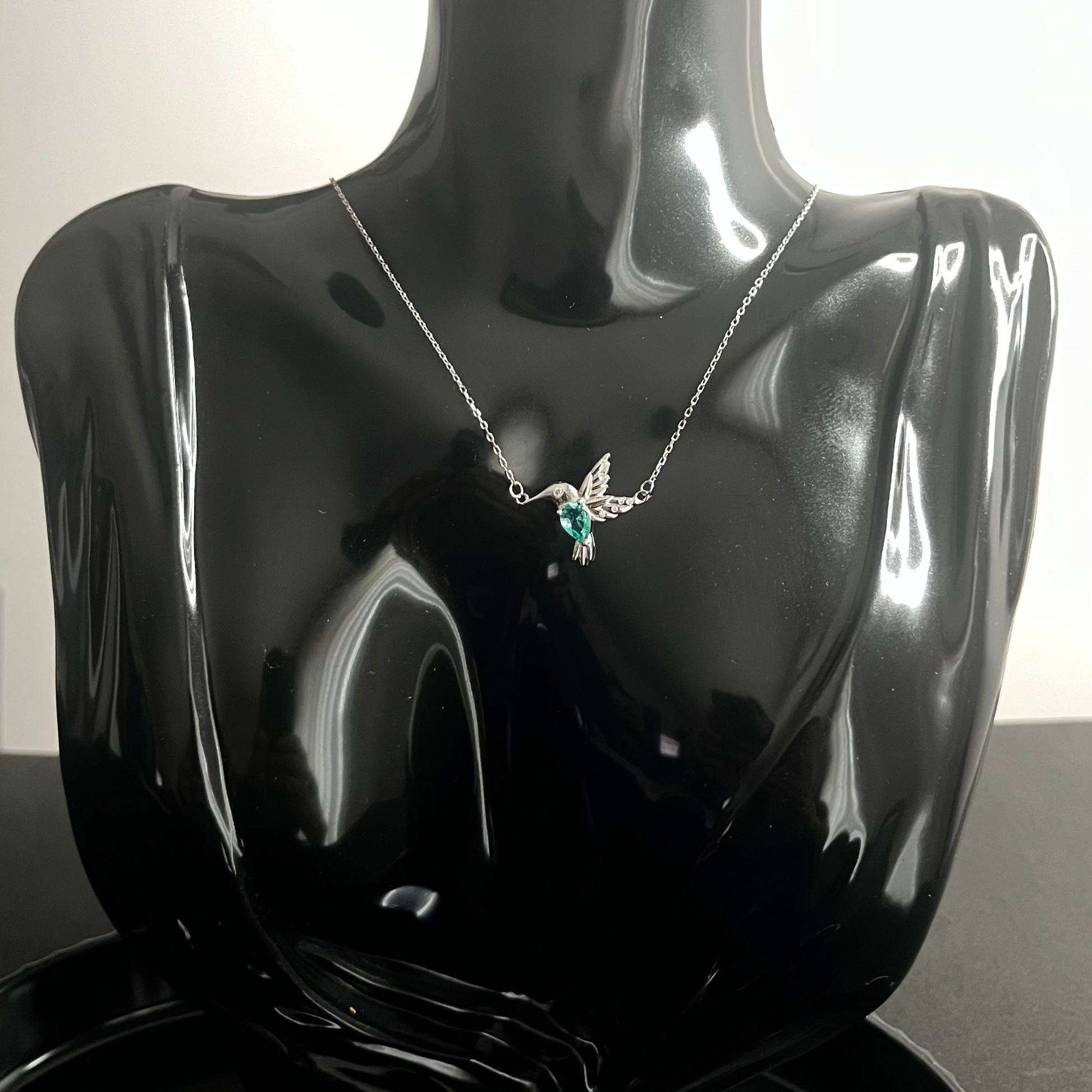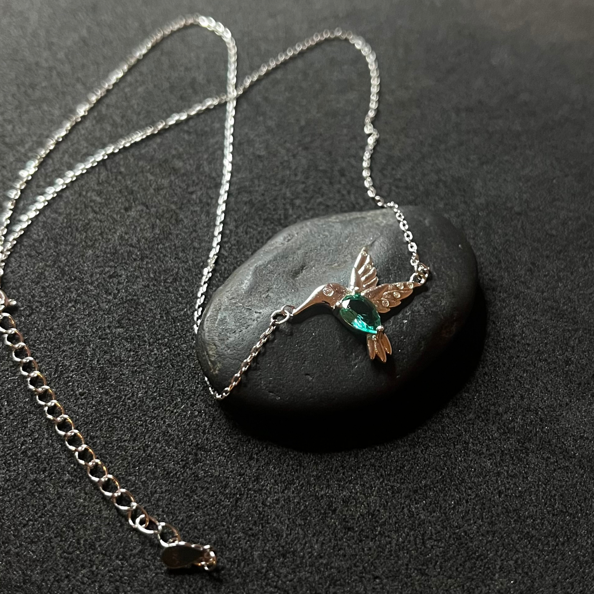 El collar Espíritu Libre simboliza la ligereza del alma y la alegría de vivir. Su delicado colibrí despliega alas, mientras una piedra central verde símbolo de esperanza y vitalidad brilla en su corazón.