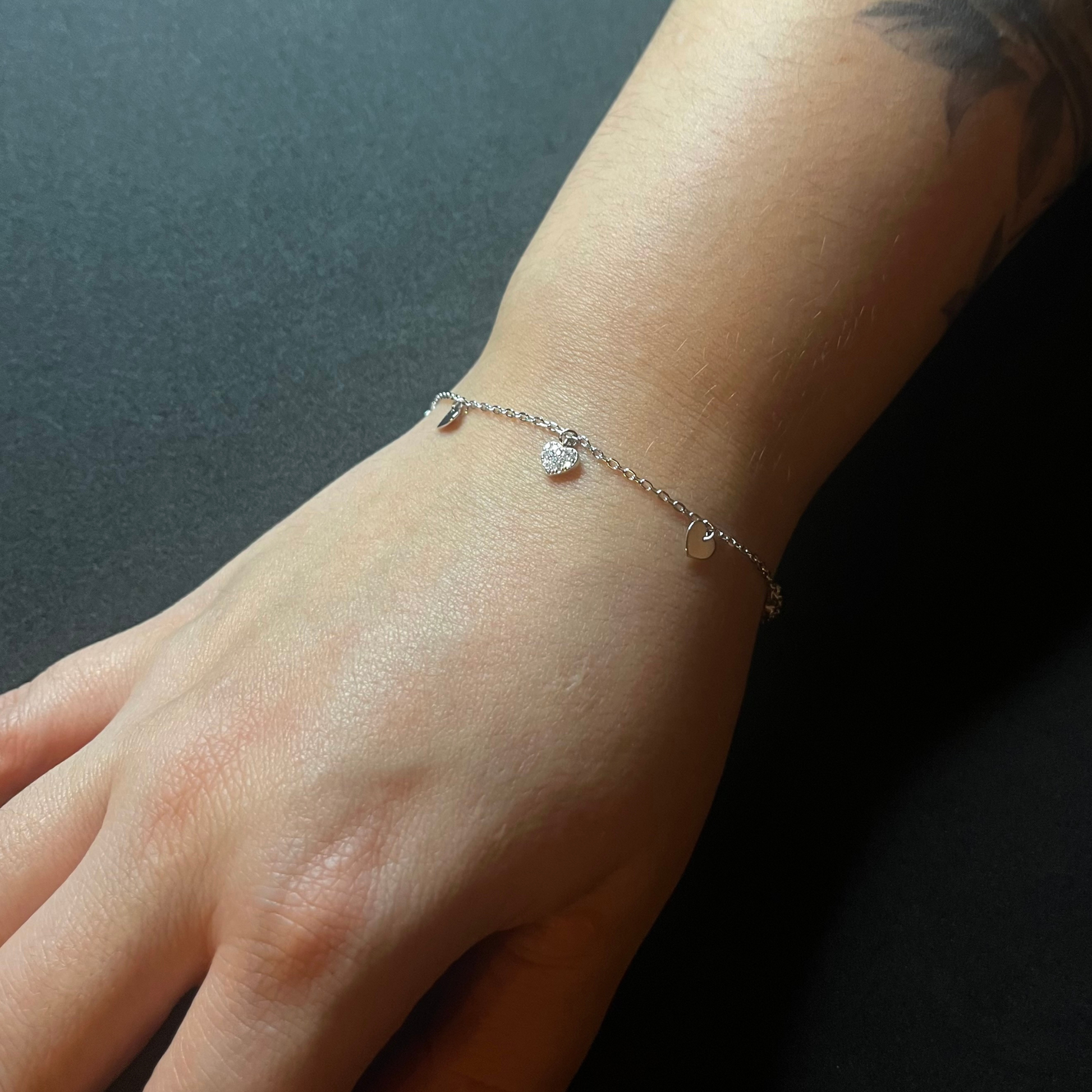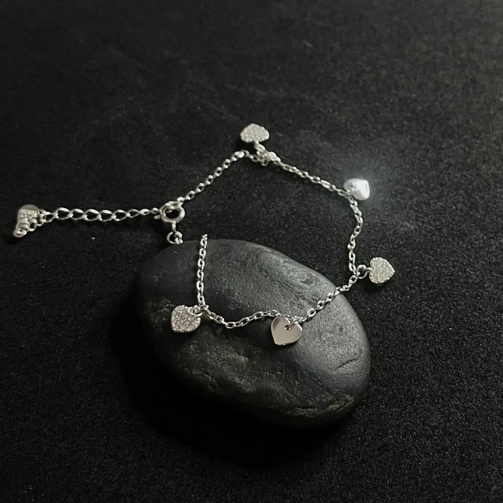 Pulsera en plata de ley 925 rodiada con dijes de corazón.