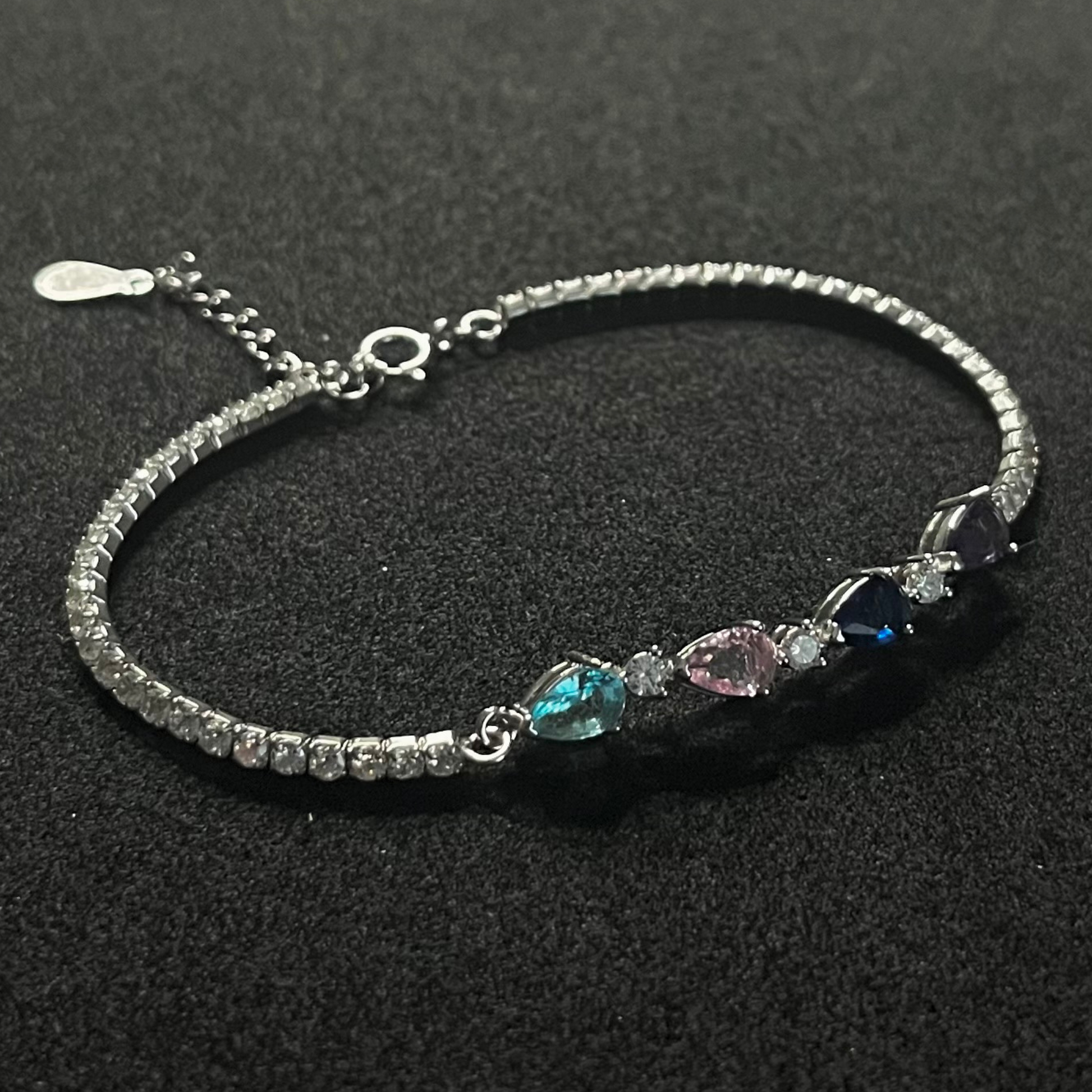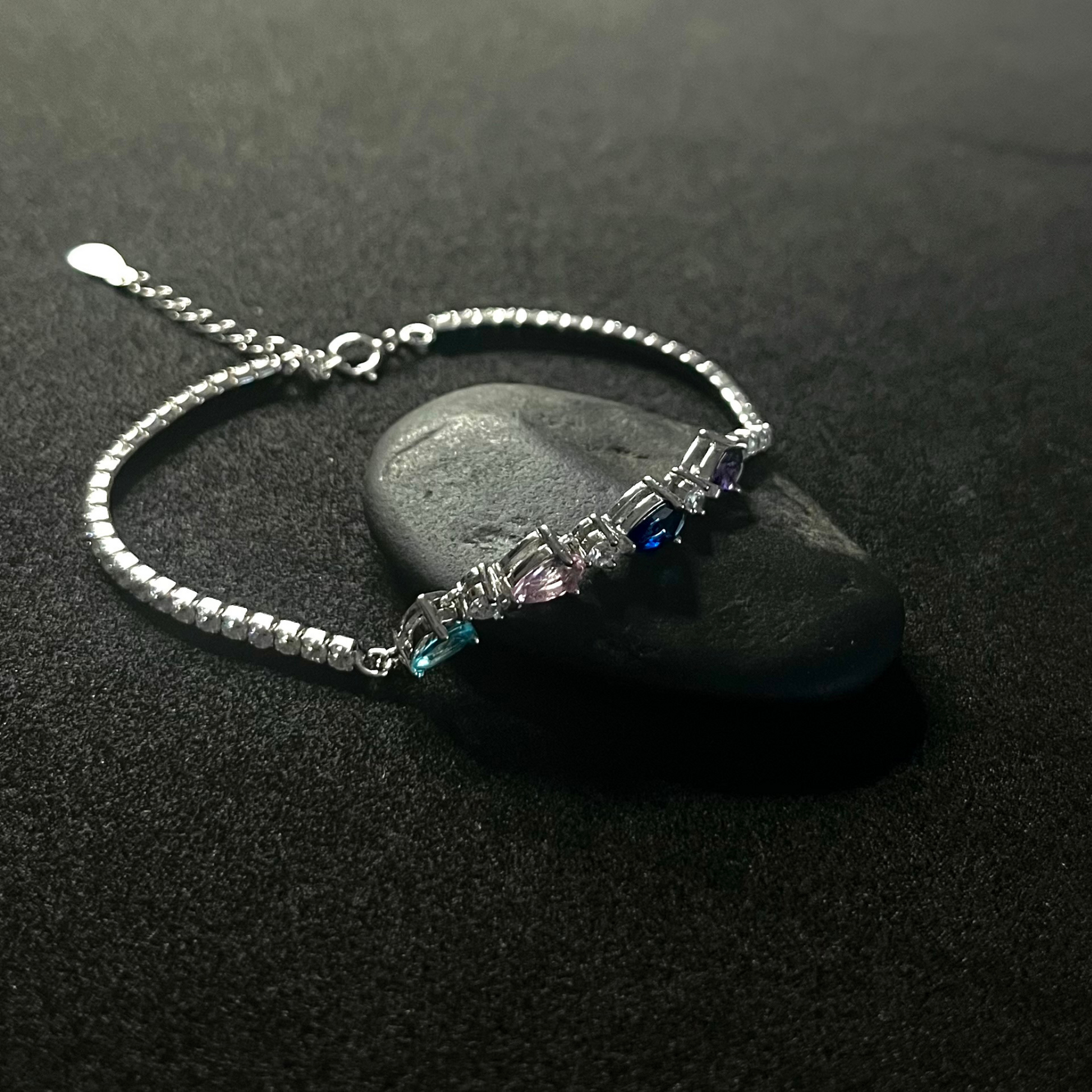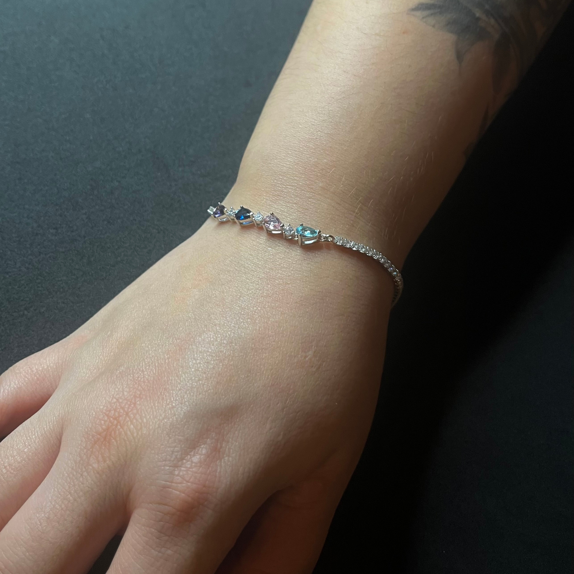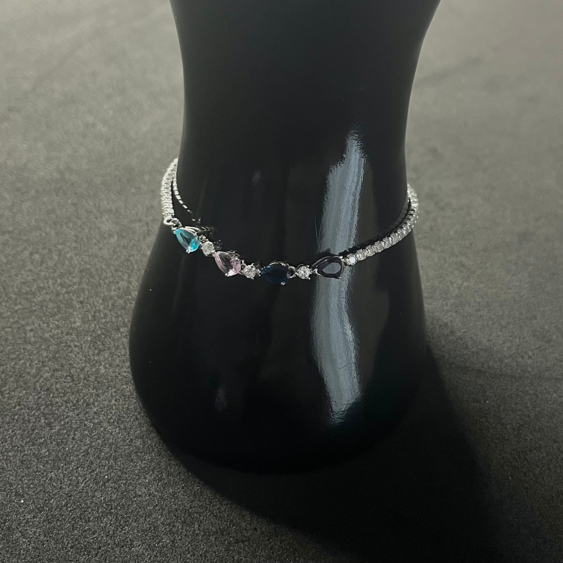 Luz Boreal combina el brillo atemporal con la sofisticación de piedras multicolor en talla lágrima. Los tonos azul, rosa y turquesa se entrelazan con el destello cristalino de las circonitas, creando una sinfonía de luz y elegancia. Una pieza refinada que aporta color y distinción a cualquier estilo.