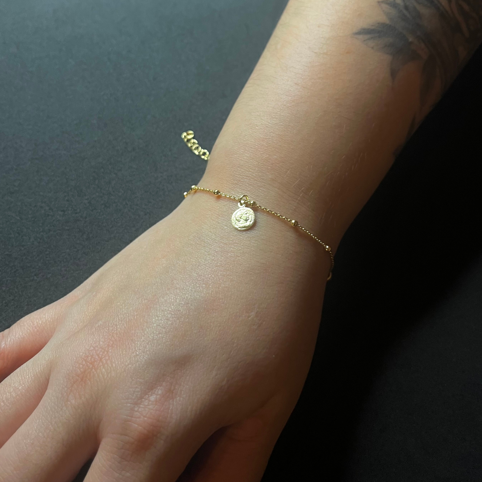 Pulsera en plata de ley 925 bañada en oro de 18K con dije de moneda.