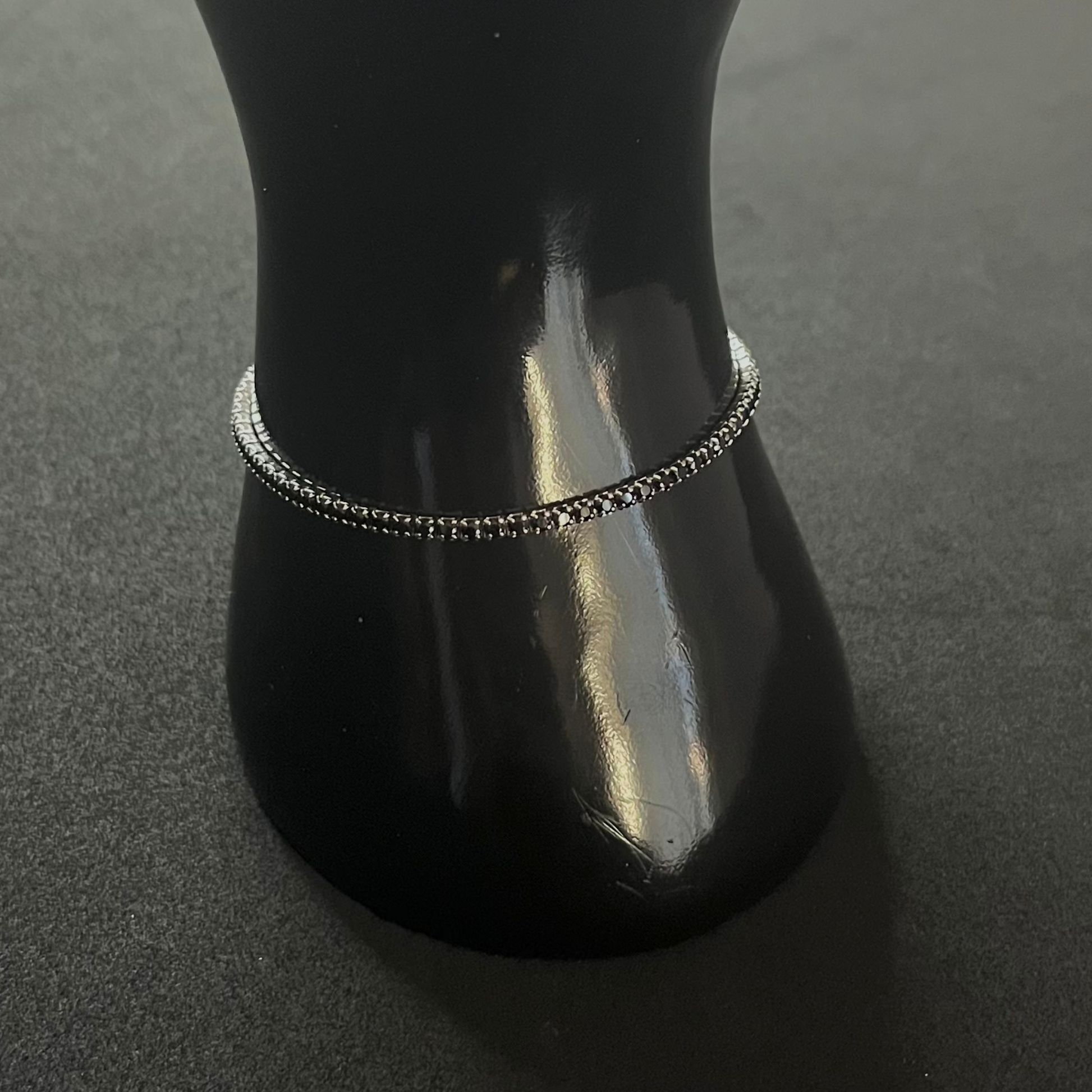 La pulsera Oscuro Destello celebra la elegancia del misterio con un diseño que irradia sofisticación. Cada circonita negra, engastada en una delicada hilera que recorre toda la pieza, capta la luz con un brillo profundo y cautivador.
